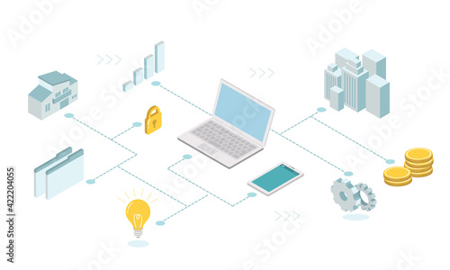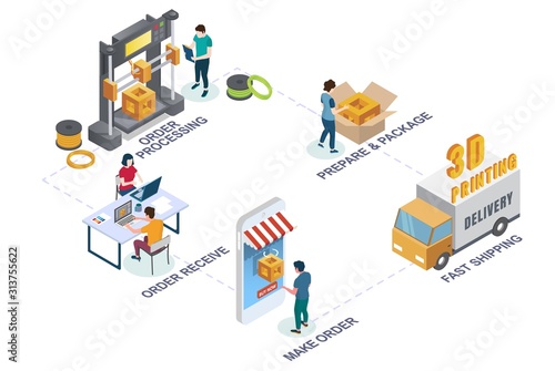 Векторная изометрическая иллюстрация процесса 3d-печати онлайн. Этапы получения и обработки заказов, упаковки и доставки онлайн-сервисов аддитивного производства.