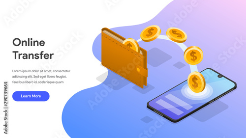 Векторный шаблон веб-сайта для благотворительных пожертвований онлайн, дизайн веб-страницы и целевой страницы для разработки веб-сайтов и мобильных сайтов. Онлайн-сервисы для концепции благотворительности с изометрическим ящиком для пожертвований, долларовыми монетами