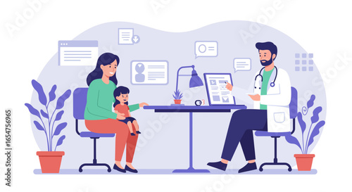 Онлайн-консультация врача, векторная плоская иллюстрация. Мужские и женские персонажи, пациенты и медицинские работники. Виртуальный визит к врачу, телемедицина, онлайн-диагностика и лечение.