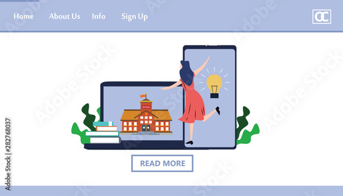 Онлайн-образование и технологии дистанционного обучения. Студенты читают книги и ищут информацию в Интернете. Векторный шаблон дизайна веб-сайта. Иллюстрация сайта целевой страницы.