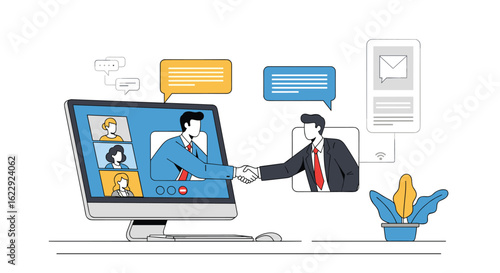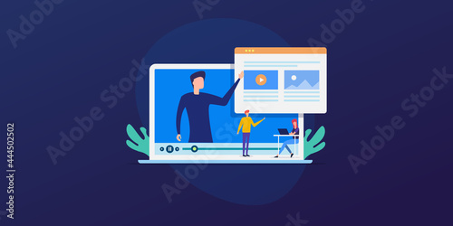 Концепция онлайн-образования. Векторная иллюстрация в плоском стиле. Элементы дизайна интернет-учебных курсов. Ноутбук на столе.