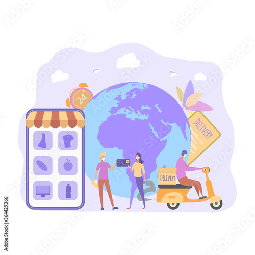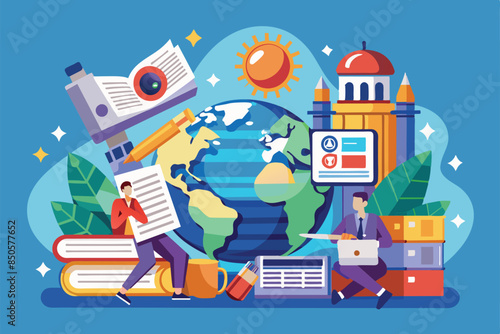 Концепция онлайн-фейковых новостей плоская векторная иллюстрация. Крошечные люди и огромный портативный компьютер с треснувшим глобусом планеты Земля, журналист с микрофоном на экране. Интернет-СМИ, дезинформация, пропаганда.