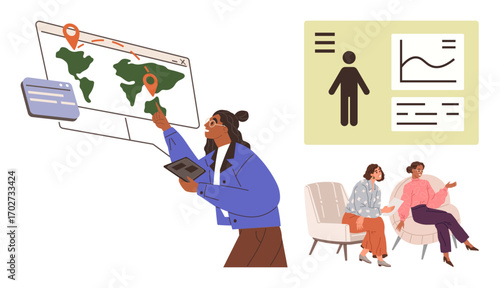 Онлайн-фейковые новости и концепция дезинформации плоская векторная иллюстрация. Молодые люди обсуждают фальшивые новости, которые они прочитали в Интернете. Преднамеренная дезинформация, мистификации, пропаганда, ложные заголовки.