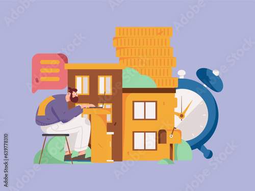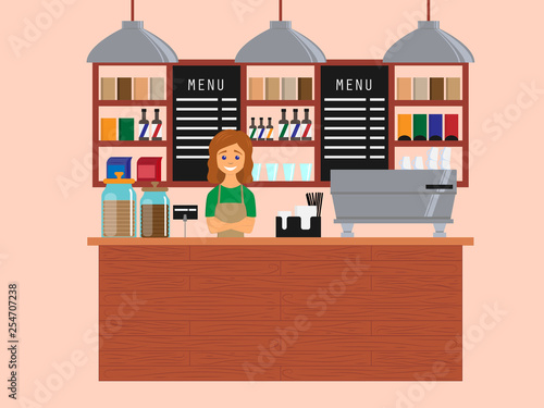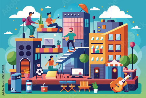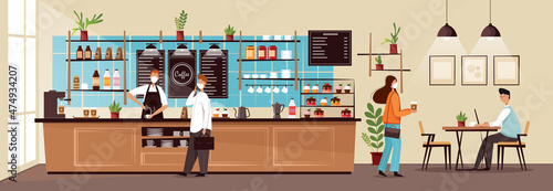 Интернет-продуктовый магазин. Гигантский смартфон, бумажный пакет с продуктами питания и крошечными персонажами с корзиной покупок, кредитная карта, плоская векторная иллюстрация. Служба доставки онлайн - заказов продуктов.