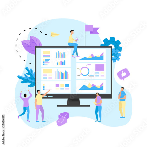 Векторная иллюстрация крошечных деловых людей, смотрящих видеолекцию на большом компьютере. Онлайн-обучение, корпоративное обучение, вебинар, конференция, концепция электронного обучения для веб-баннера, страницы веб-сайта и т.д.