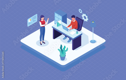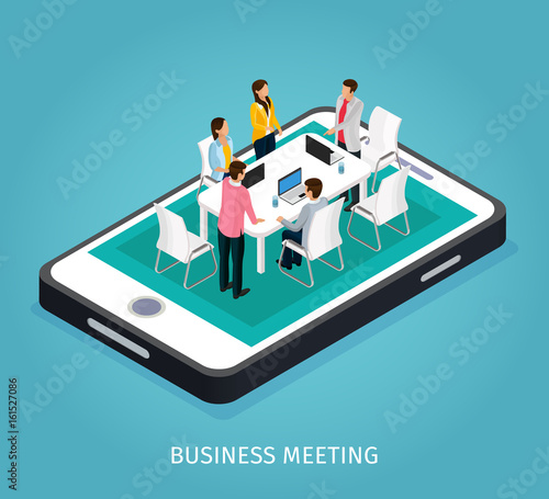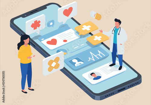 Изометрический прилавок аптечного магазина, врач-фармацевт и пациент на экране смартфона, векторная иллюстрация. Интерьер аптеки с полками, фармацевтическими стеллажами, полными лекарств. Интернет-аптека.