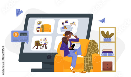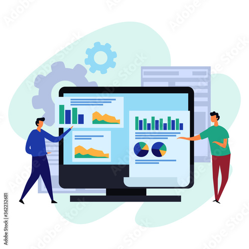 Онлайн-покер, векторная иллюстрация дизайна в плоском стиле. Азартные игры в Интернете, концепция зала онлайн-казино с крошечными персонажами игроков, большим монитором компьютера и ноутбуком с игральными картами на экранах.
