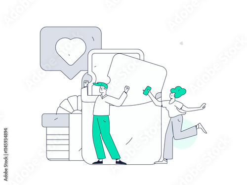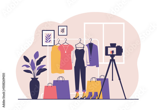 Огромный планшет с тентом, микро-женские персонажи, выбирающие одежду в интернет-магазине и оплачивающие онлайн, векторная иллюстрация дизайна в плоском стиле. Электронная коммерция, концепция онлайн-покупок.