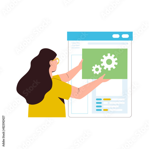 Женщина, покупающая обувь и одежду в интернет-магазине, посещающая торговый сайт, векторная иллюстрация дизайна в плоском стиле. Сайт онлайн-покупок, концепция электронной коммерции для веб-баннера, страницы веб-сайта и т.д.