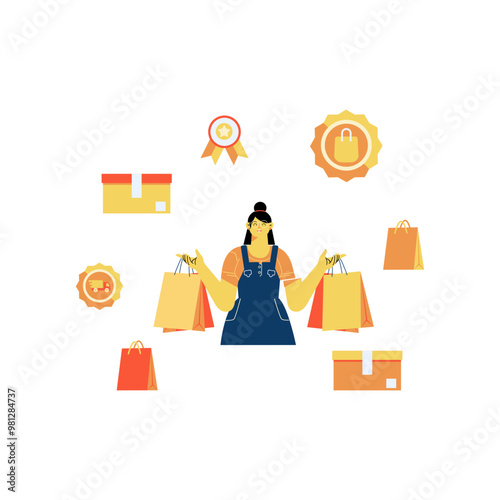 Интерьер магазина женской одежды и красное платье на манекене, хозяйственная сумка, посылка, кошелек с кредитной картой, векторная иллюстрация. Онлайн-оплата картой, интернет-магазины.