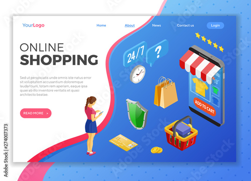 Шаблон целевой страницы для интернет-магазинов для разработки веб-сайтов и мобильных сайтов. Векторный изометрический мобильный телефон, женщина с корзиной, полной покупок, кредитная карта. Концепция веб-страницы интернет-магазина.