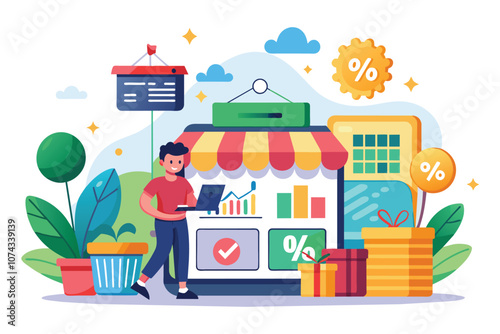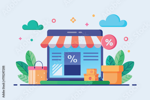 Интернет-магазины с вектором распродаж и скидок. Цифровой магазин - магазин в смартфоне. Розничный сервис мобильных приложений. Заказ, покупка и доставка товаров через интернет