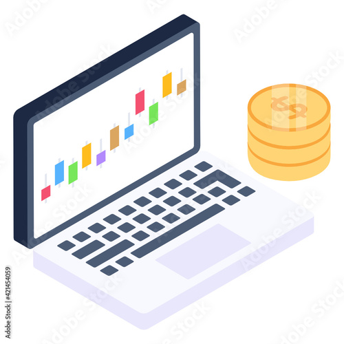 Игровой автомат на ноутбуке в векторном формате. Компьютерная игра Jackpot fruit gambling 777. Изометрический дизайн, выделенный на белом фоне.