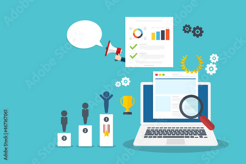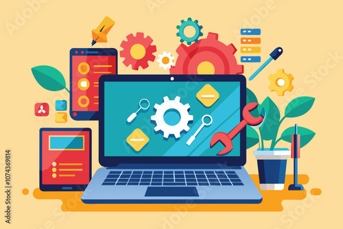 Векторная иллюстрация дизайна в плоском стиле концепции онлайн-обучения. Ноутбук с видео-тренировкой по фитнесу, курс диеты, гантели, музыкальный плеер с наушниками. Плакат, баннер онлайн-услуг спортивного коучинга.