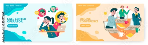 Онлайн-видеоконференция, общение в бизнес-команде. Оператор колл-центра. Иллюстрация концепции онлайн-видеочата. Векторный шаблон дизайна веб-сайта. Иллюстрация сайта целевой страницы.