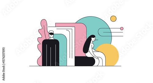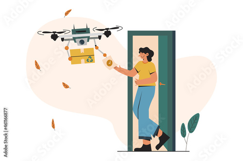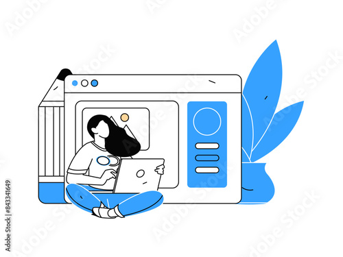 Девушка с наушниками и смартфоном, выполняющая позу йоги warrior 2 дома вместе с онлайн-тренером на экране мобильного телефона, векторная иллюстрация дизайна в плоском стиле. Онлайн-классы по йоге и медитации.
