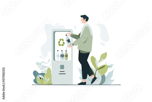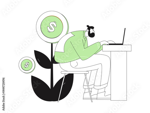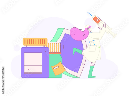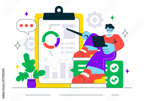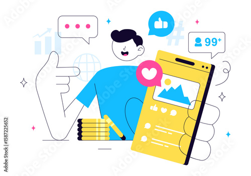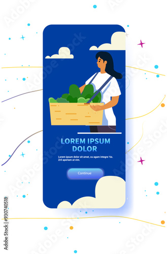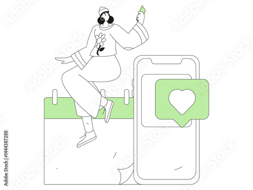 Девушка с наушниками и смартфоном, выполняющая позу йоги warrior 2 дома вместе с онлайн-тренером на экране мобильного телефона, векторная иллюстрация дизайна в плоском стиле. Онлайн-классы по йоге и медитации.