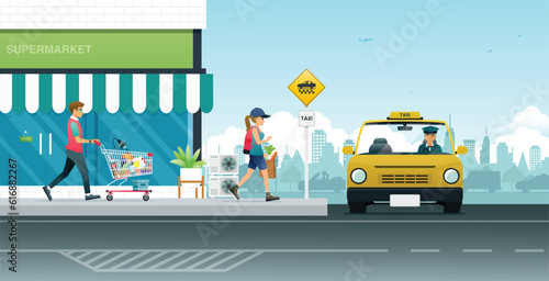 Кинотеатр под открытым небом, векторная иллюстрация. Персонажи мужского и женского пола смотрят фильм на большом экране, сидя на земле и крыше автомобиля на стоянке. Кинотеатр на открытом воздухе, шаблон плаката кинотеатра drive-in