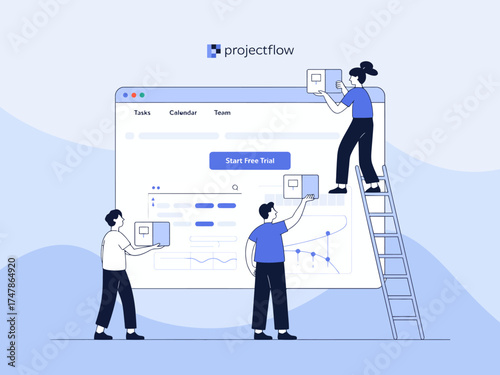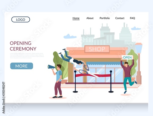 Векторный шаблон веб-сайта церемонии открытия, дизайн веб-страницы и целевой страницы для разработки веб-сайтов и мобильных сайтов. Концепция празднования открытия магазина с персонажами.