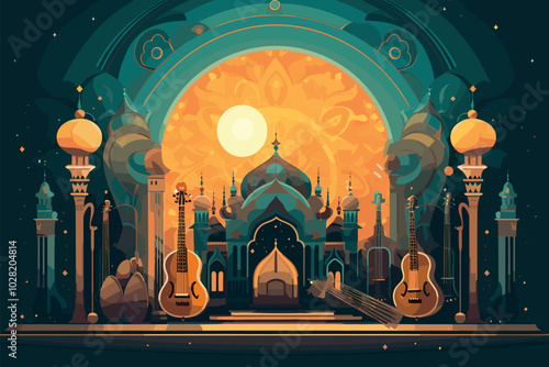 Сцена оперного театра с красными занавесами. Симфонический оркестр, выступающий на сцене, векторная иллюстрация. Дирижер и музыканты играют на скрипке, контрабасе, флейте, тубе. Концерт классической музыки.