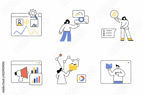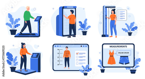 Офтальмологический набор, плоская векторная изолированная иллюстрация. Персонажи пациентов-врачей-окулистов. Таблица для проверки зрения. Осмотр зрения офтальмологом, проверка зрения. Оптометрия, офтальмологическая диагностика