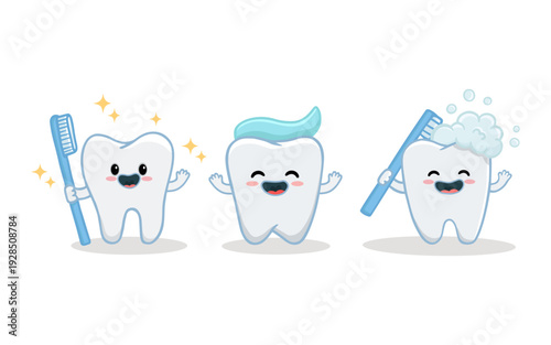 Векторный плакат с зубной нитью для ухода за полостью рта, шаблон баннера. Улыбающиеся здоровыми белыми зубами мультяшные персонажи с ниткой зубной нити в контейнере. Детская стоматология, здоровье полости рта, чистка и гигиена зубов