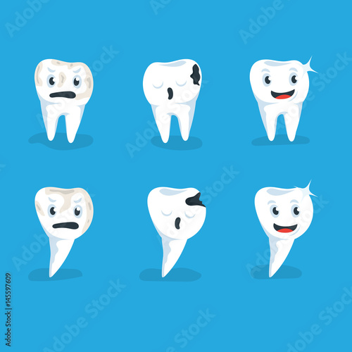 Векторный плакат с зубной нитью для ухода за полостью рта, шаблон баннера. Счастливые герои мультфильмов со здоровыми белыми зубами с помощью зубной нити-зубочистки. Детская стоматология, чистка зубов и гигиена.