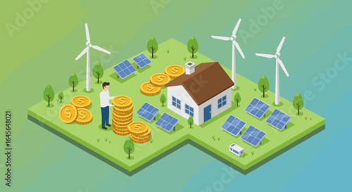 Органическое земледелие. Теплица, ветряные турбины и солнечные панели, плоская векторная изометрическая иллюстрация. Теплица, использующая чистую энергию солнца и ветра. Зеленая альтернативная энергетика. Эко-ферма.