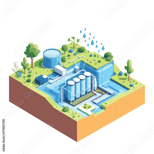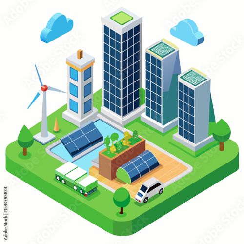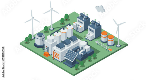 Органическое земледелие. Теплица, ветряные турбины и солнечные панели, плоская векторная изометрическая иллюстрация. Теплица, использующая чистую энергию солнца и ветра. Зеленая альтернативная энергетика. Эко-ферма.