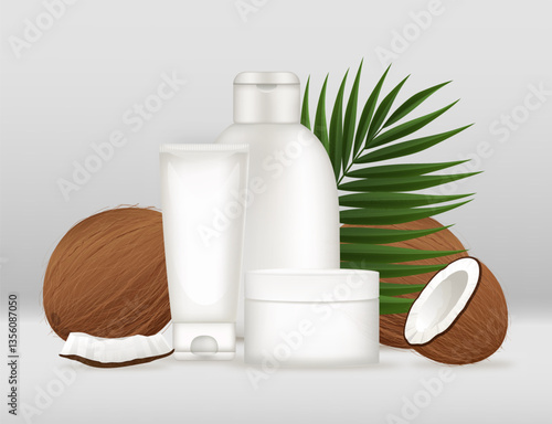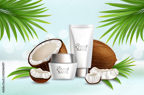 Шаблон баннера плаката с органическим кокосовым молоком. Векторная реалистичная композиция из бутылки с молоком, кокосовых орехов, брызг кокосового молока, пальмовых листьев и пространства для копирования. Реклама немолочных веганских продуктов.