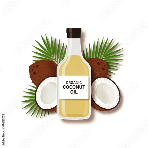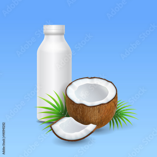Векторная иллюстрация кокосового молока. Реалистичная композиция из бутылки молока с кокосовыми орехами и пальмовыми листьями для плаката, баннера и т.д. Органический немолочный веганский продукт.