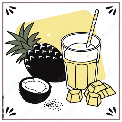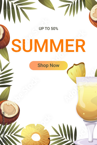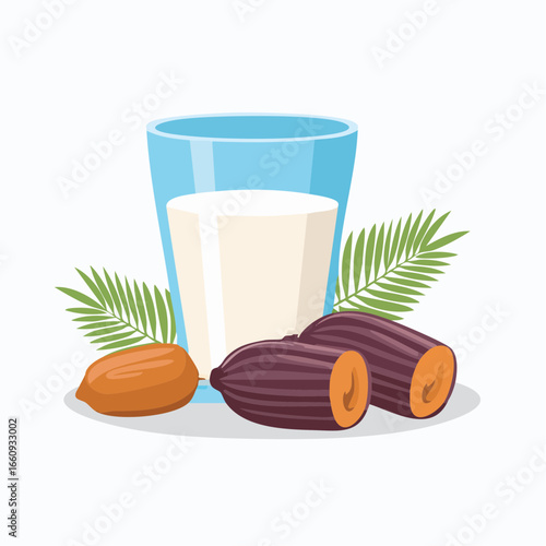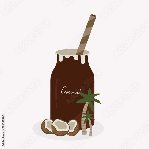Векторная иллюстрация кокосовой воды. Реалистичная композиция органического напитка в алюминиевой банке, кокосы, пальмовые листья для плаката, баннера и т.д. Упаковка освежающего кокосового сока.