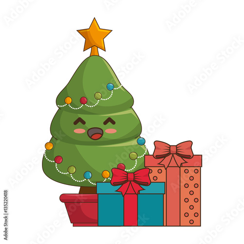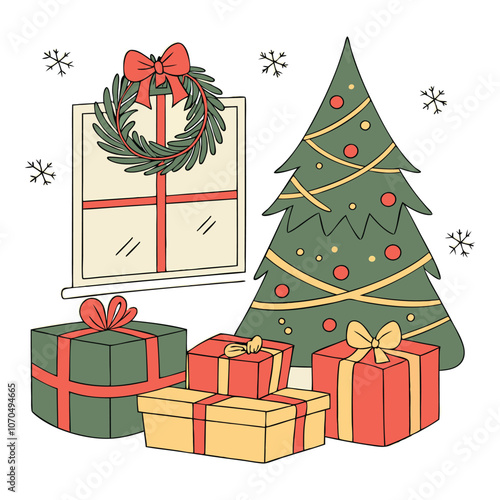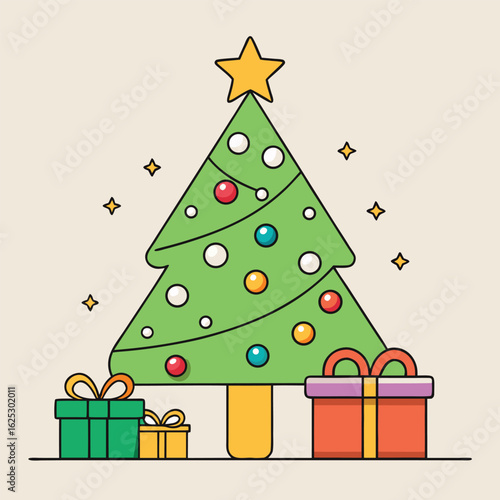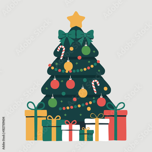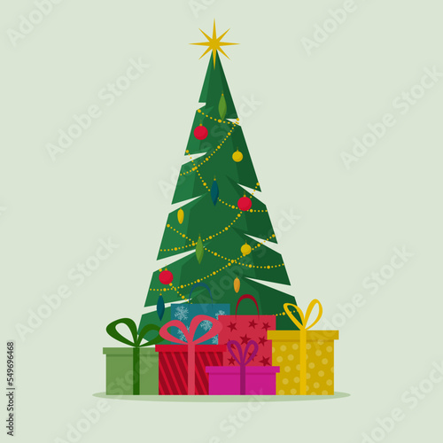Рождественская елка со звездой и вектором подарков. Елка оригами, украшенная к Рождеству и Новому году. Декоративный шарик-безделушка, подарочная коробка с иллюстрацией-сюрпризом для поздравительной открытки в стиле вырезки из бумаги