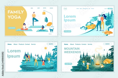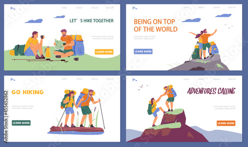Векторный набор баннеров для приключений на открытом воздухе. Веб-шаблоны для каякинговых туров, летних приключений и лесных кемпингов. Дизайн в плоском стиле.
