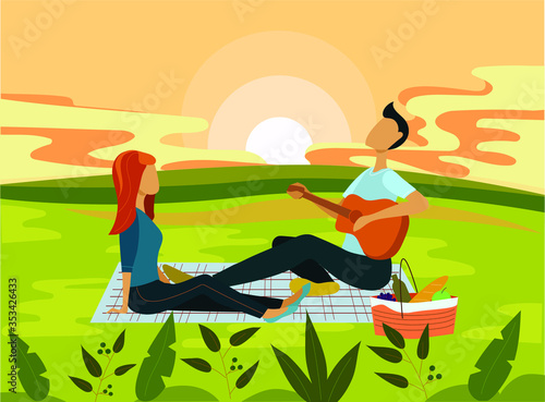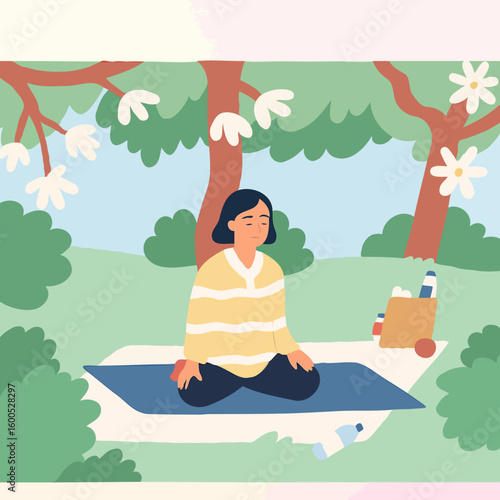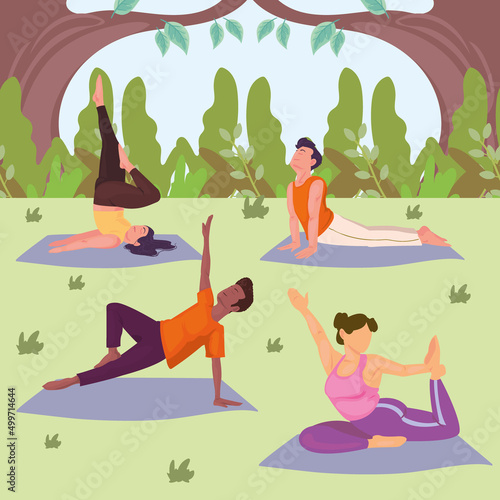Занятие йогой на открытом воздухе в природном горном пейзаже. Векторная иллюстрация концепции упражнений йоги. Мужчина и женщина тренируются вместе, мультяшные персонажи. Здоровый образ жизни, занятия спортом.