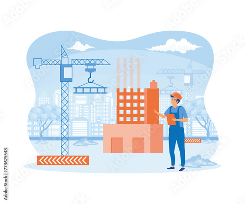 Вырезанная из бумаги строительная площадка в стиле ремесла с башенными кранами, силуэты рабочих-строителей, векторная иллюстрация. Развитие здания. Строительная промышленность.