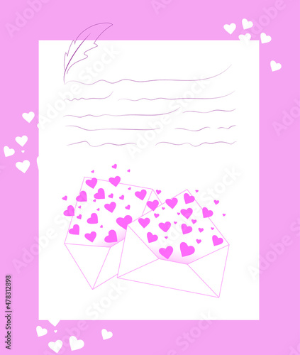 Вырезанное из бумаги ремесленное письмо в стиле Дня Святого Валентина с любовным посланием. Открытый конверт с любовным посланием, розовые цветы, сердечки, птица, векторная иллюстрация. Поздравительная открытка, шаблон приглашения.