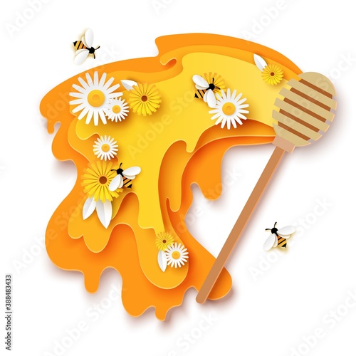 Вырезанный из бумаги ремесленный стиль, струящийся мед, деревянный ковш, милые пчелы, летающие над цветущими цветами и собирающие нектар. Векторная иллюстрация в стиле бумажного искусства. Пчеловодство, логотип органического медового продукта, этикетка.