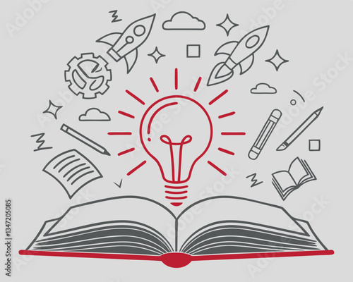 Вырезанная из бумаги открытая книга, древо знаний, карандаш, символы естественных наук и школьных предметов. Векторная иллюстрация в стиле бумажного художественного ремесла. Концепция знаний и образования.