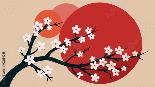 Вырезанная из бумаги ветка дерева сакура с распускающимися цветами, цветущей вишней и круглой рамкой, векторная иллюстрация. Весенний фон, цветочный баннер, плакат, шаблон флаера с местом для копирования.