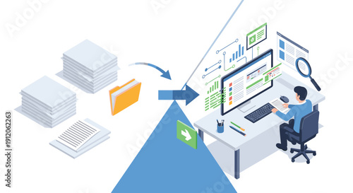 Схема процесса переработки бумаги, векторная изометрическая иллюстрация. Сокращение загрязнения и отходов, сохранение Земли и окружающей среды с помощью технологий вторичной переработки.