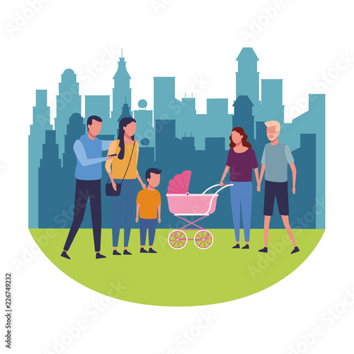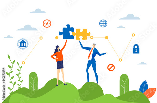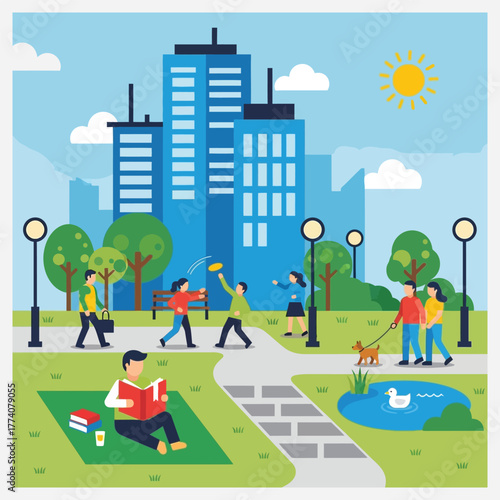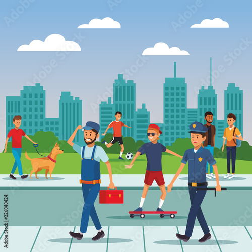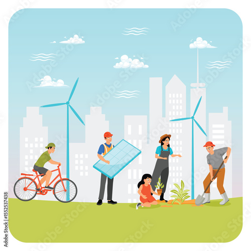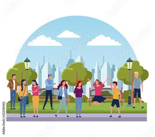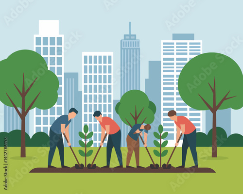 Команда волонтеров группа молодых людей мужского и женского пола, подметающих и собирающих мусор в городском парке, векторная иллюстрация. Уборка парка, концепция волонтерства для веб-баннера, страницы веб-сайта и т.д.