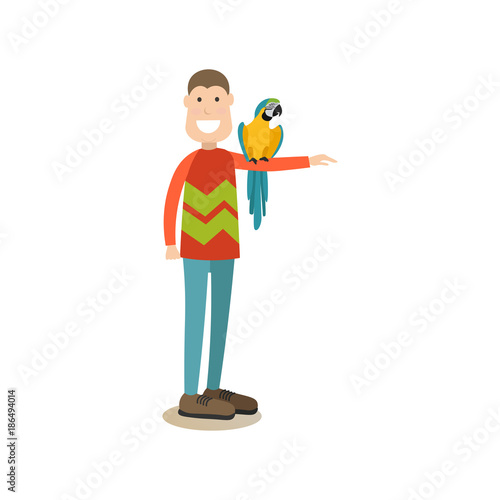 Векторная иллюстрация человека, держащего попугая на руке, играющего со своей любимой тропической птицей. Владелец домашнего животного или дрессировщик попугаев и его элемент дизайна в плоском стиле какаду, значок, выделенный на белом фоне.