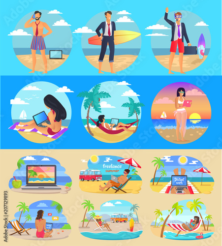 Путешествующие пассажиры внутри поезда, автобуса, самолета и автомобиля, векторная плоская изолированная иллюстрация. Персонажи мужского и женского пола путешествуют на различных транспортных средствах. Дорожное и летное путешествие.