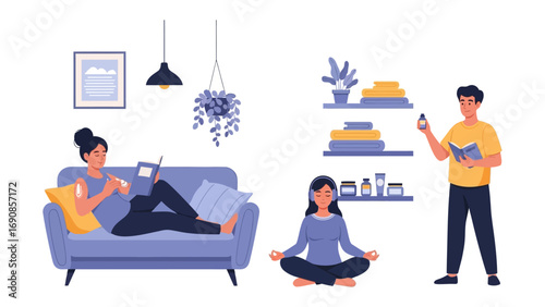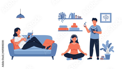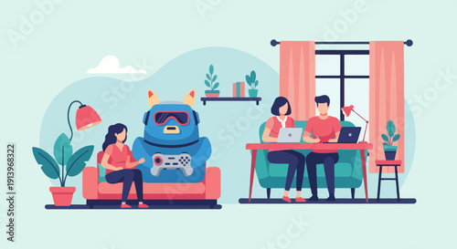 Пассажиры, путешествующие на самолете, плоская векторная иллюстрация. Туристы, счастливая пара, мать с дочерью сидят в удобных креслах внутри самолета. Интерьер самолета. Авиаперелет.