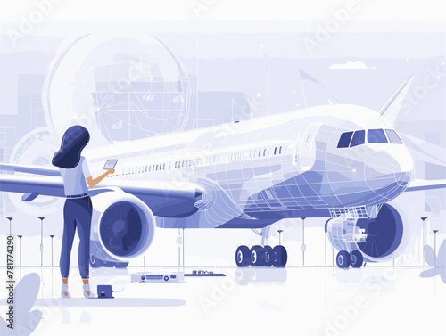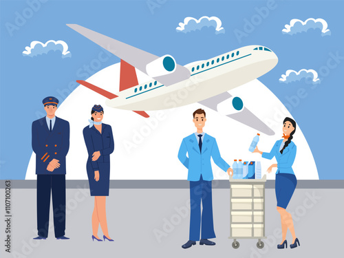 Пассажиры, стюардесса в масках для защиты от коронавируса Covid-19 во время процедуры посадки, плоская векторная иллюстрация. Новые правила полета с противовирусными препаратами в самолете, новая норма авиаперелетов, безопасный полет