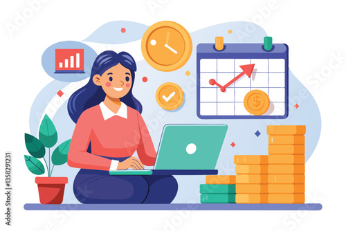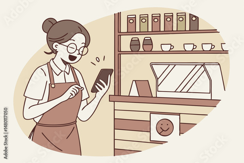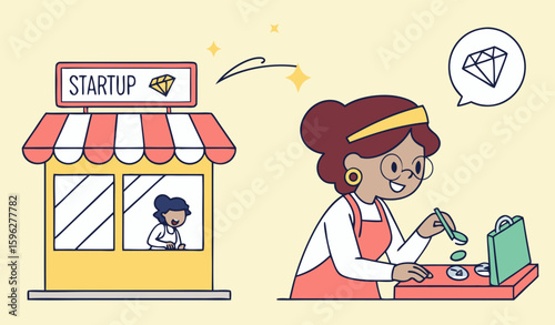 Интерьер ломбарда, ростовщик смотрит на дорогую вещь под увеличительным стеклом, оценивая ее стоимость, плоская векторная иллюстрация. Услуги ломбарда.