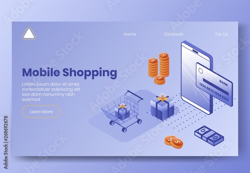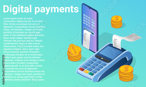 Векторный шаблон веб-сайта платежных терминалов, дизайн веб-страницы и целевой страницы для разработки веб-сайтов и мобильных сайтов. Изометрический pos-терминал с банковской картой, мобильный телефон с бумажной квитанцией.