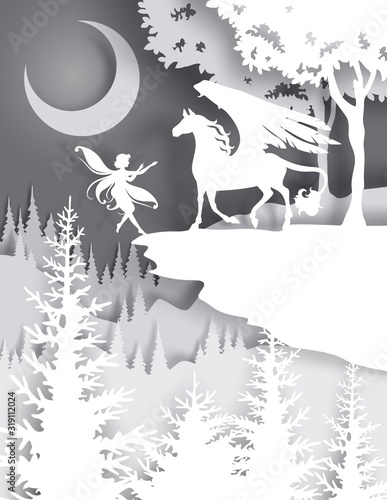 Пегас, крылатый конь, силуэт волшебного мифического сказочного персонажа, векторная иллюстрация. Сказочная композиция в стиле paper art craft.