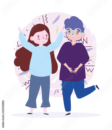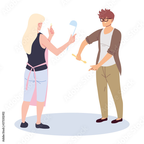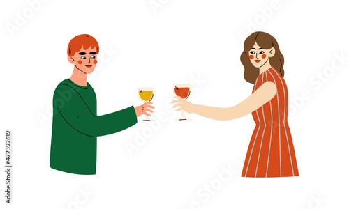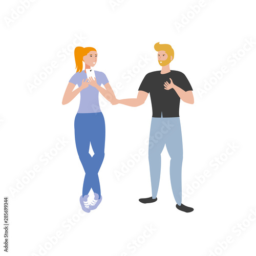 Векторная иллюстрация мужчины, дающего букет красных тюльпанов женщине. Счастливая любящая пара. Концепция людей и отношений элемент дизайна в плоском стиле, значок, выделенный на белом фоне.